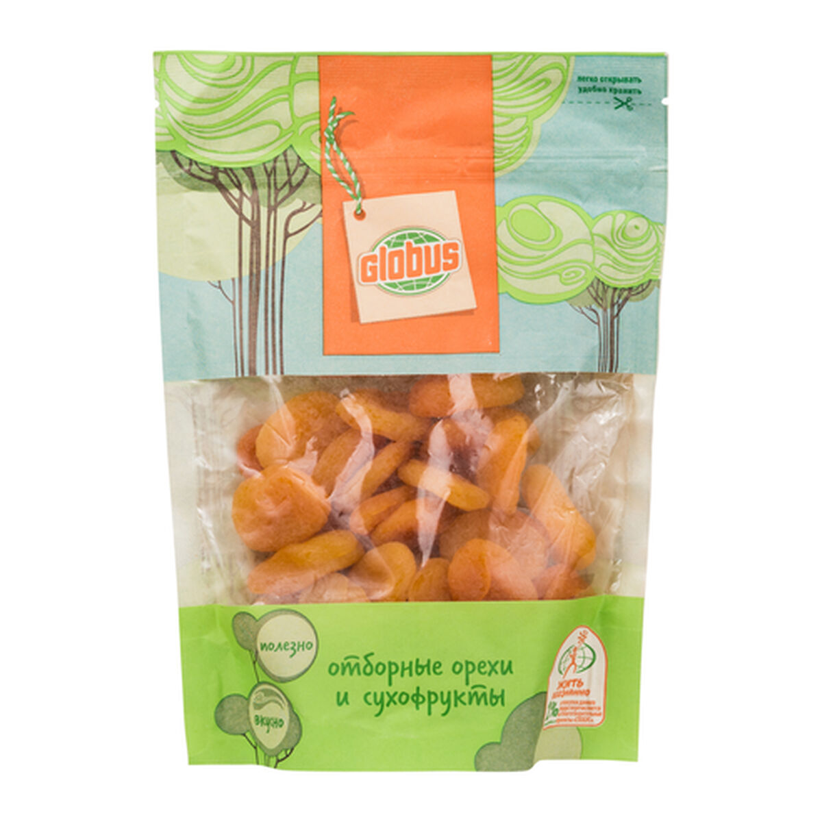 Абрикос сушеный целый, без косточки, под торговой маркой Globus произведен АО «Орехпром» для ООО «Гиперглобус» в России. Образец приобретен в интернет-магазине «Глобус».