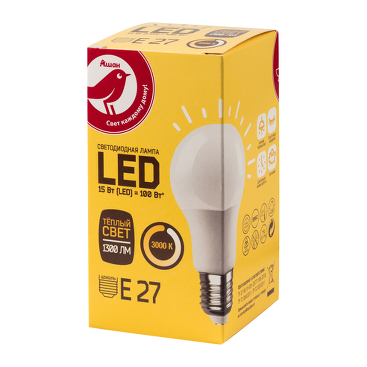 Электрические источники света бытового назначения: лампы светодиодные со встроенным пускорегулирующим аппаратом для общего освещения под торговой маркой «Ашан» произведены ООО «Бел Лайт Групп» в России. Образец приобретен в интернет-магазине «Ашан».
