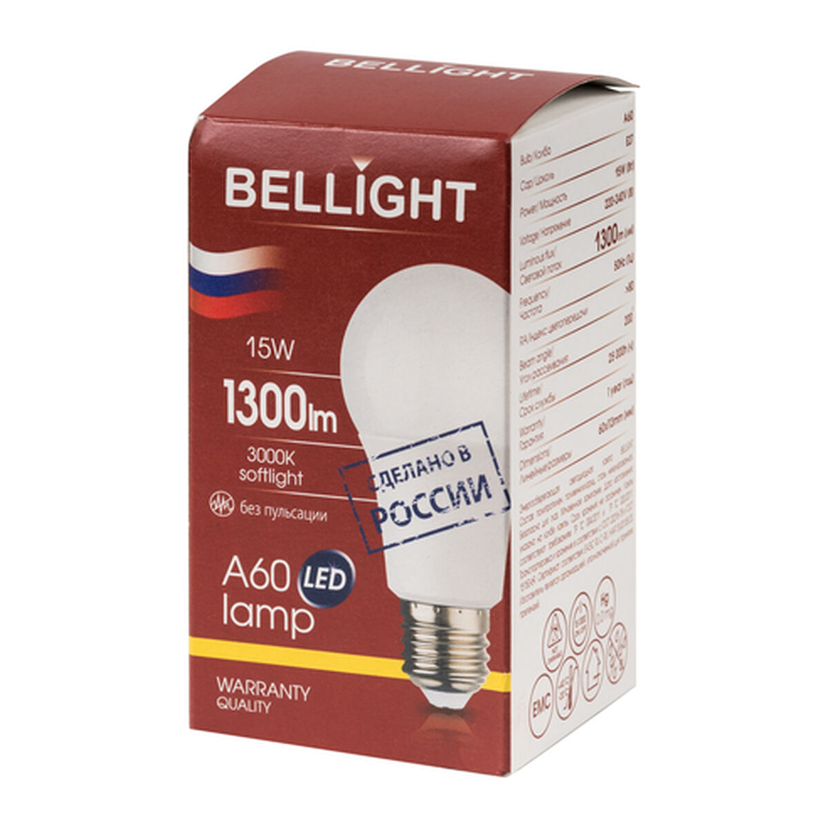 Энергосберегающая светодиодная лампа под торговой маркой Bellight произведена ООО «Бел Лайт Групп» в России. Образец приобретен в интернет-магазине Ozon.