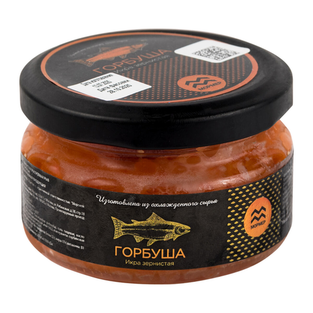 Икра зернистая лососевых рыб, икра горбуши, пищевая рыбная продукция, сорт первый, под торговой маркой «МорМер» произведена ООО «Морской Меридиан» в России. Образец приобретен в интернет-магазине «Азбука вкуса».