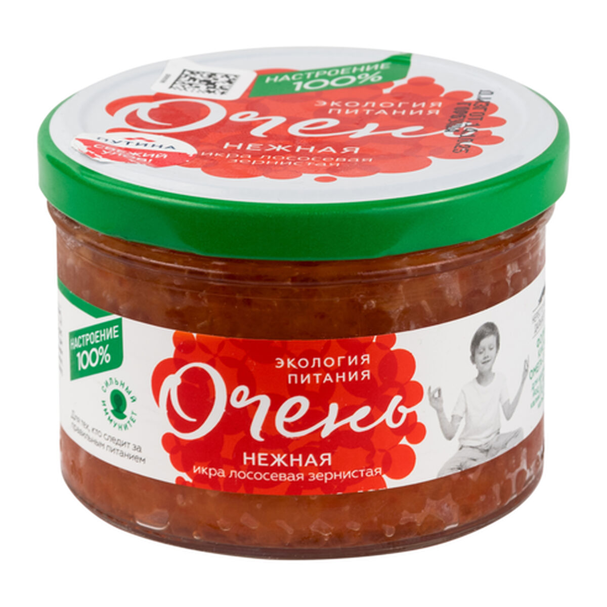 Икра зернистая лососевых рыб, соленая, охлажденная, первый сорт, горбуша, под торговой маркой «Очень нежная» произведена ООО «Путина» в России. Образец приобретен в магазине «Лента» по адресу: г. Москва, Волгоградский пр-кт, д. 177, стр. 1.
