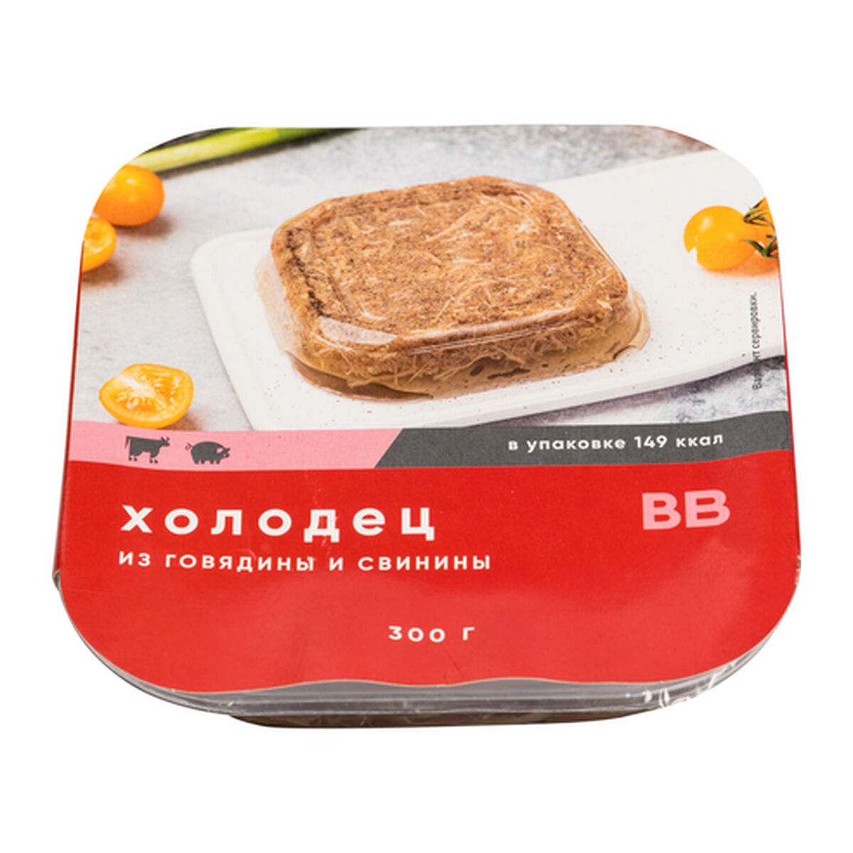 Холодец представляет собой застывшую, равномерно перемешанную массу, состоящую из желе и мелко нарубленного отварного мяса. Поверхность продукта ровная, с незначительным количеством жира на поверхности желе. На разрезе представляет собой кусочки рубленного вареного мяса в прозрачном желе. Форма и размер продукта соответствуют форме упаковки (квадратной); длина / ширина / высота составляют 13 / 13 / 3 см соответственно.