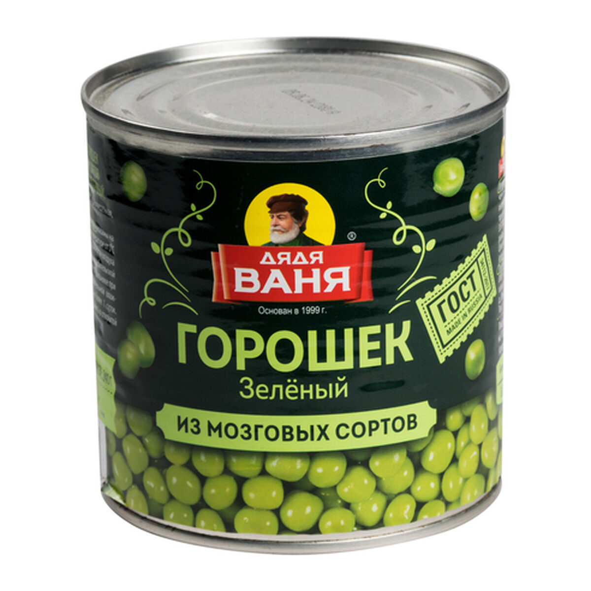 Консервы овощные, горошек зеленый из мозговых сортов, стерилизованный, сорт первый, под торговой маркой «Дядя Ваня» произведены ООО «Консервное предприятие Русское поле — Албаши» в России. Образец приобретен в магазине «Лента» по адресу: г. Балашиха, мкр. Саввино, ул. Пригородная, стр. 90.