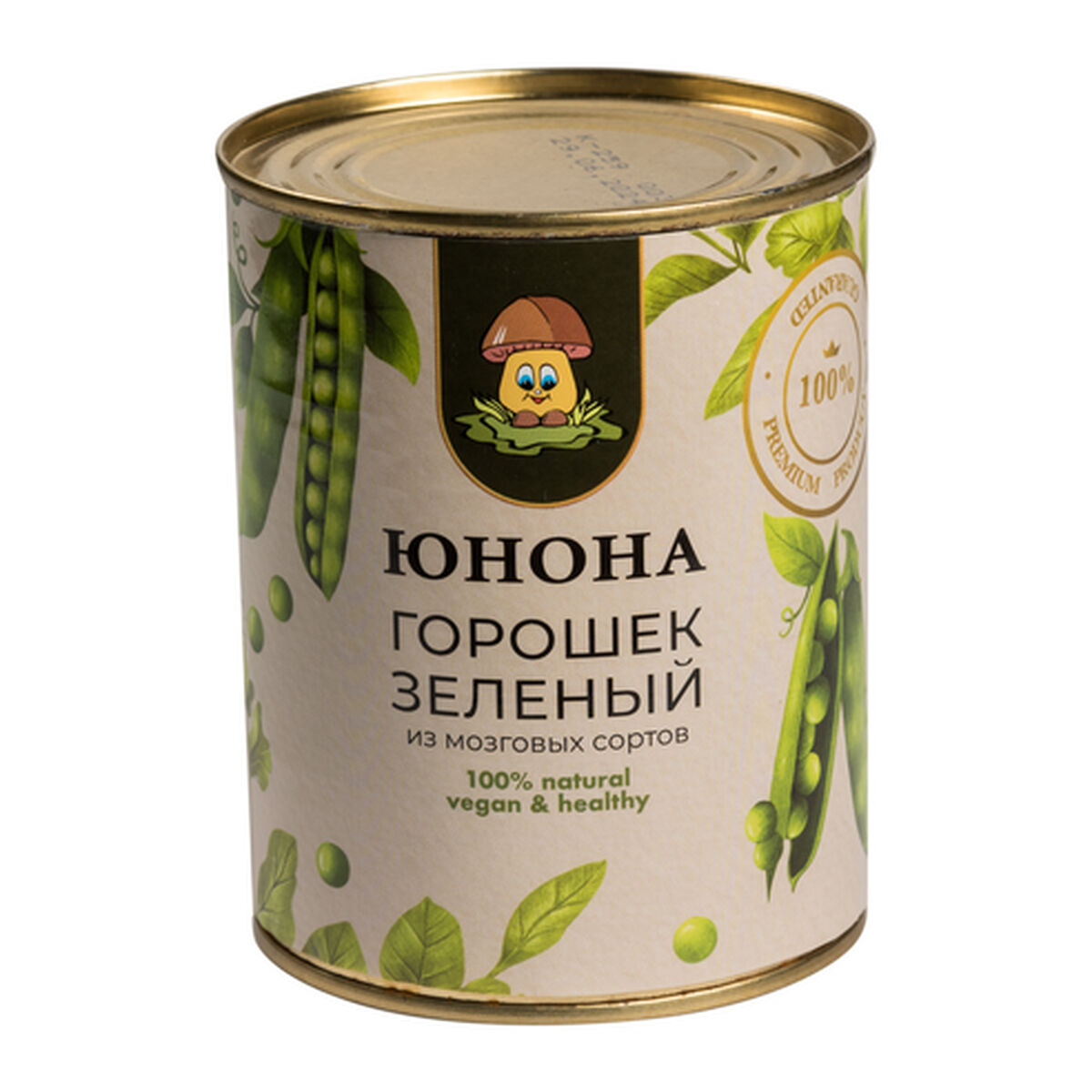 Консервы овощные, горошек зеленый из мозговых сортов, стерилизованный, высший сорт, под торговой маркой «Юнона» произведены ООО «Юнона Инвест Лтд» в России. Образец приобретен в интернет-магазине Ozon.