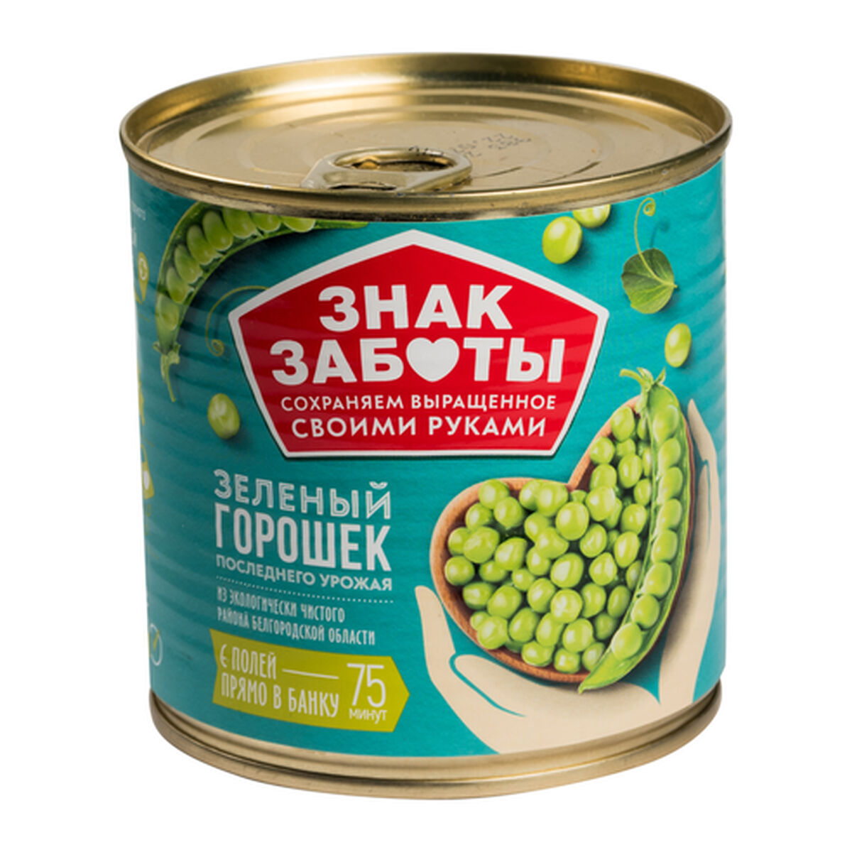 Консервы овощные, горошек зеленый, высший сорт, под торговой маркой «Знак заботы» произведены ООО «Белгородский консервный комбинат» в России. Образец приобретен в магазине «О'кей» по адресу: г. Москва, ул. Святоозерская, д. 1А.