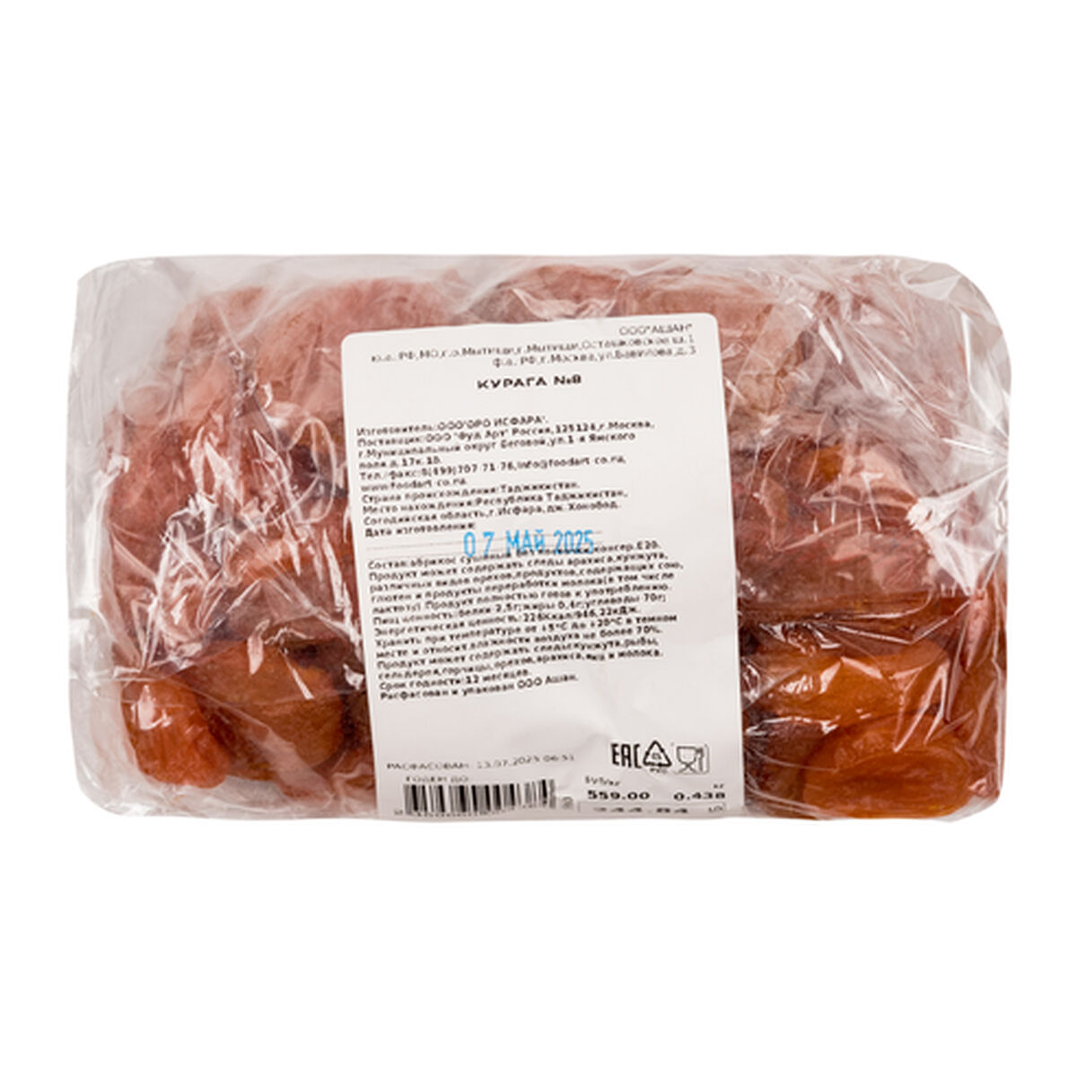 Курага № 8 под торговой маркой «Оро Исфара» произведена ООО «Оро Исфара» для ООО «Ашан» в Таджикистане. Образец приобретен в магазине «Ашан» по адресу: г. Москва, ул. Вавилова, д. 3.