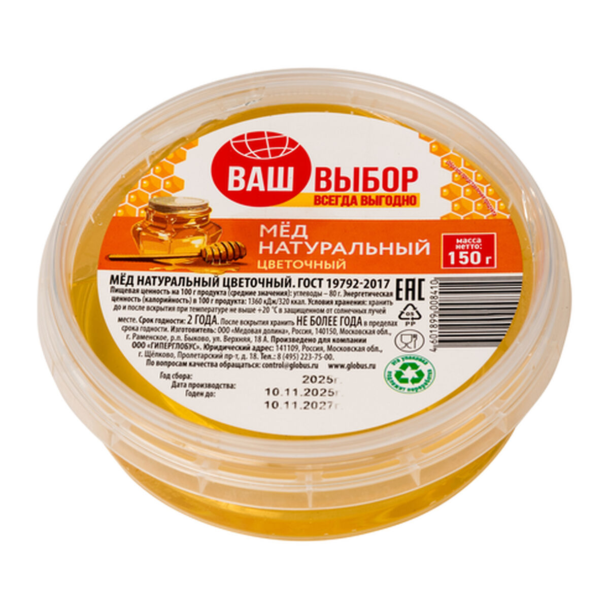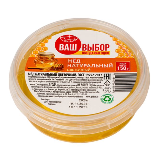 Мед натуральный цветочный под торговой маркой «Ваш выбор» произведен ООО «Медовая долина» для ООО «Гиперглобус» в России. Образец приобретен в магазине «Глобус» по адресу: Московская обл., г. Котельники, Новорязанское ш., д. 24.
