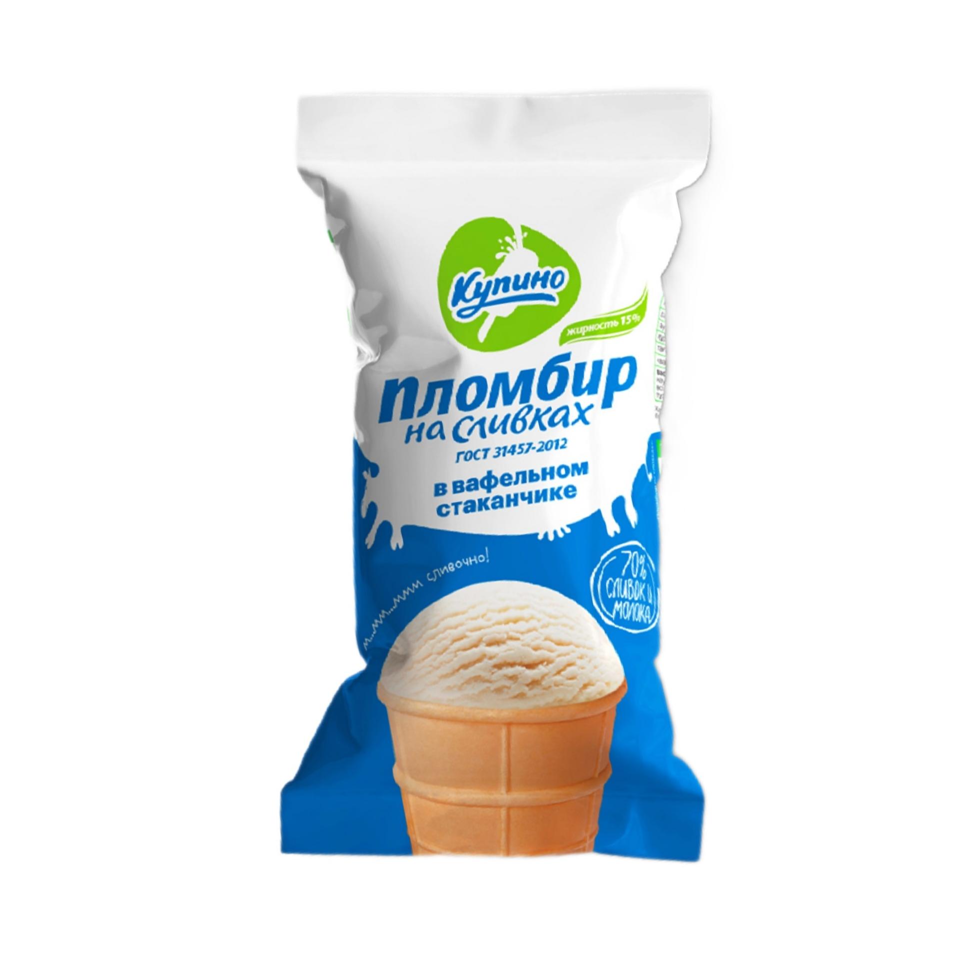 Мороженое, пломбир ванильный в вафельном стаканчике, «Пломбир на сливках», под торговой маркой «Купино» произведено ООО «Купинское мороженое» в России. Образец приобретен в магазине «Валерия» по адресу: г. Новосибирск, ул. Дениса Давыдова, д. 4.
