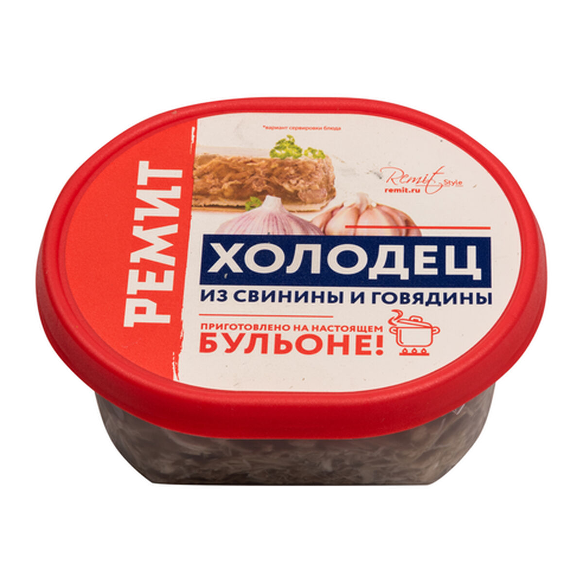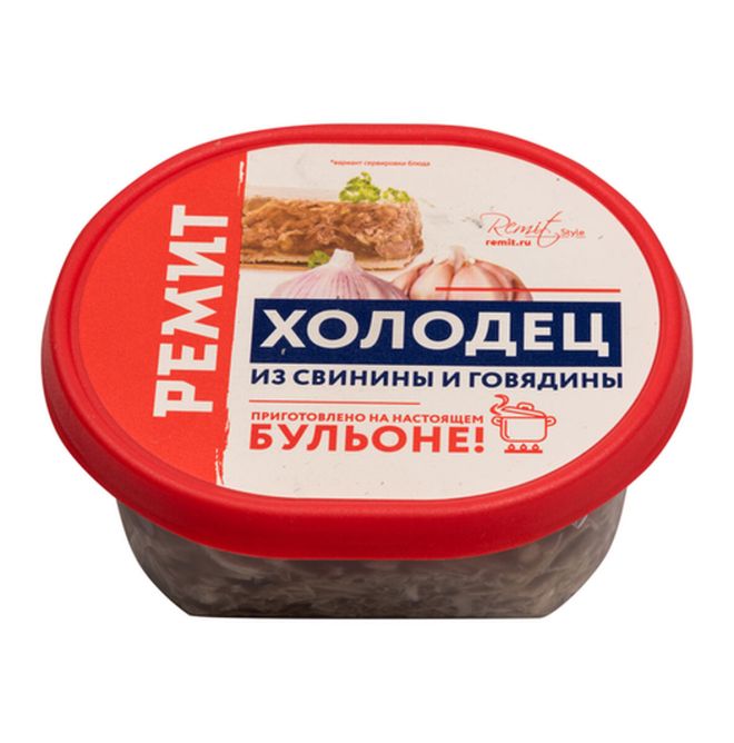 Мясосодержащее колбасное изделие из термически обработанных ингредиентов, холодец из свинины и говядины, под торговой маркой «Ремит» произведено ООО «Мясоперерабатывающий завод Ремит» в России. Образец приобретен в интернет-магазине vprok.ru.