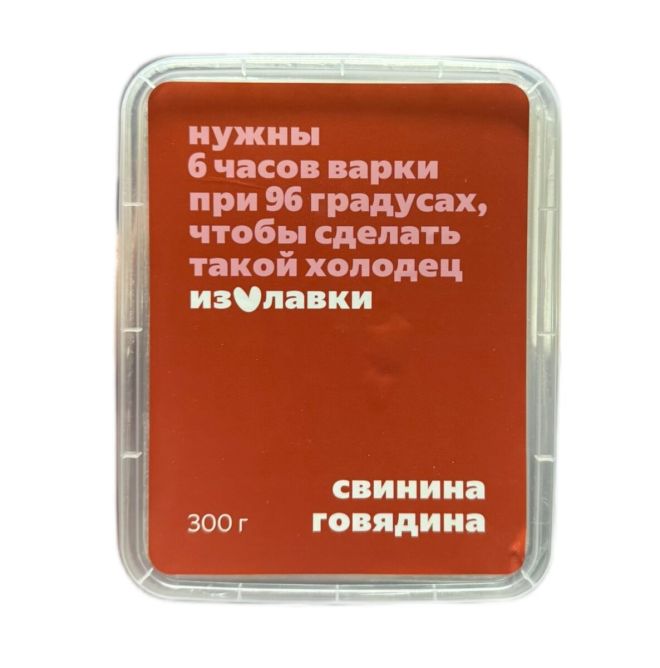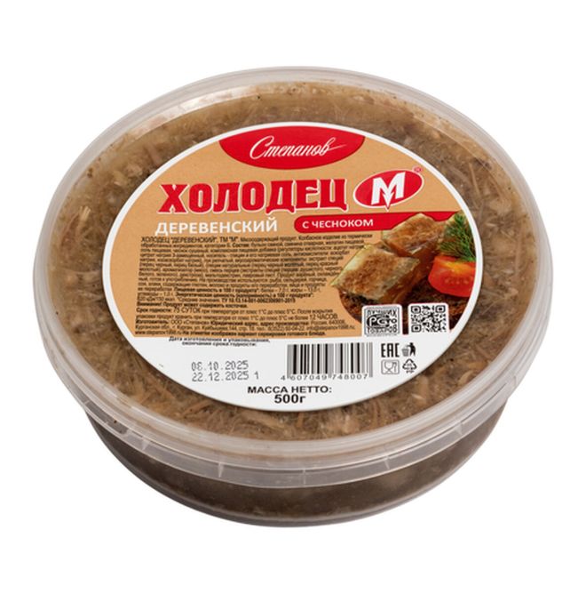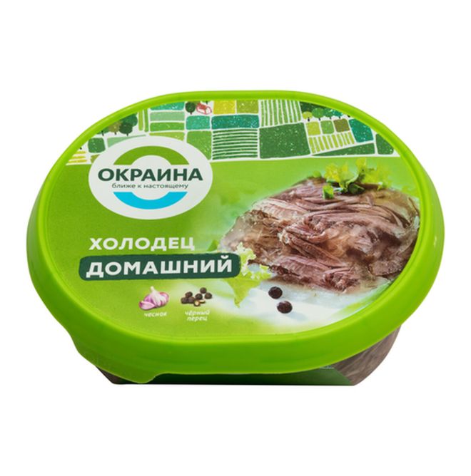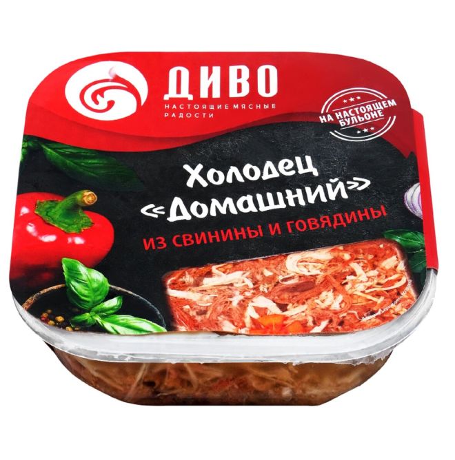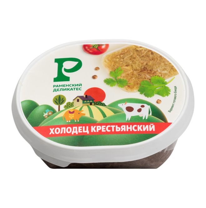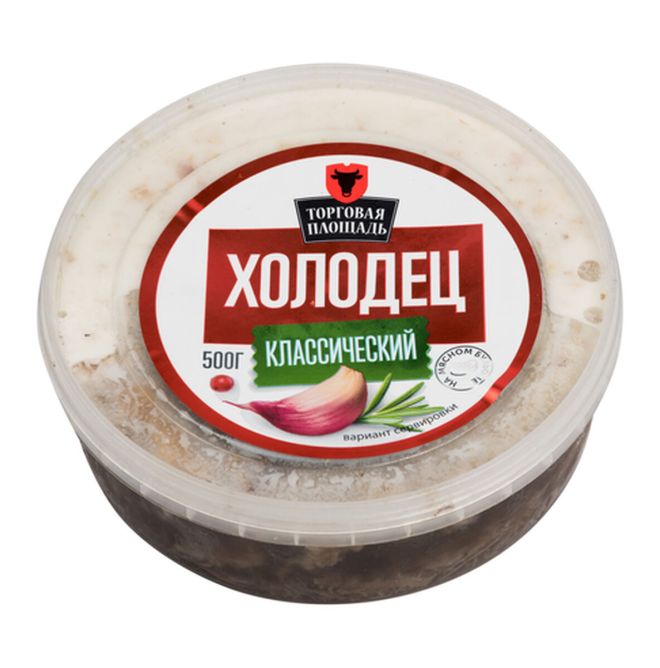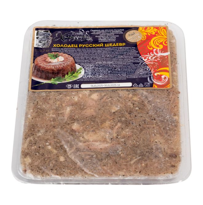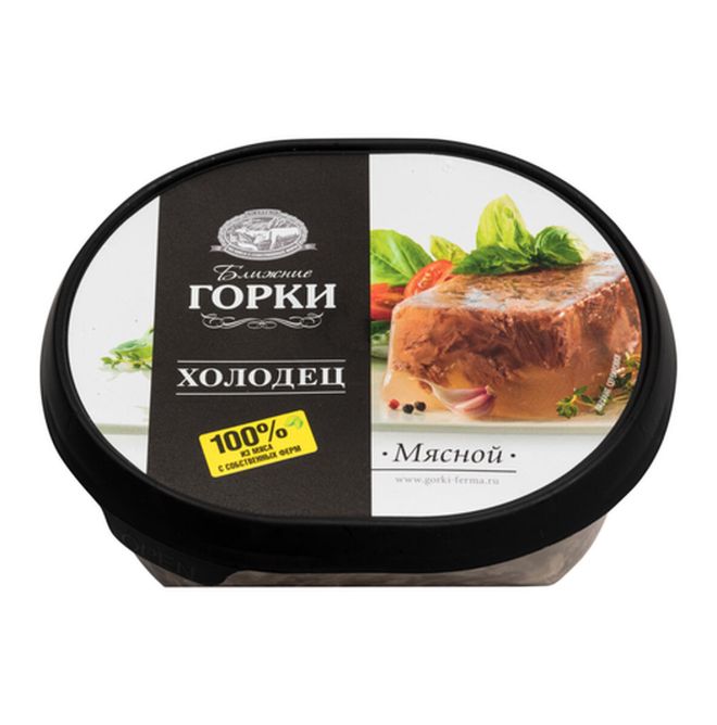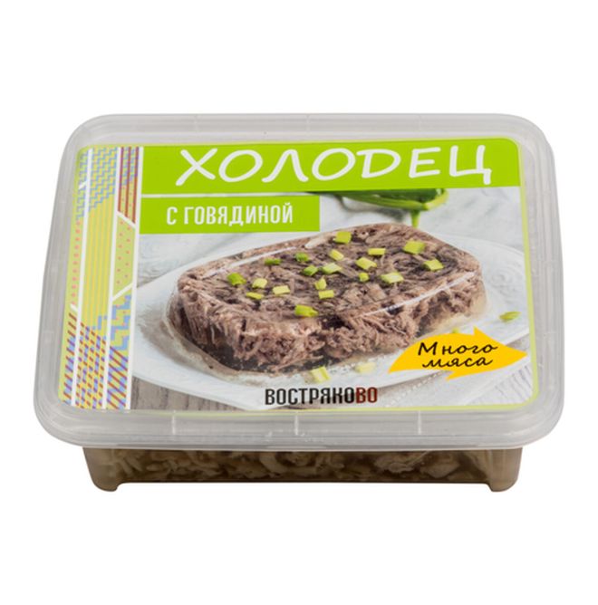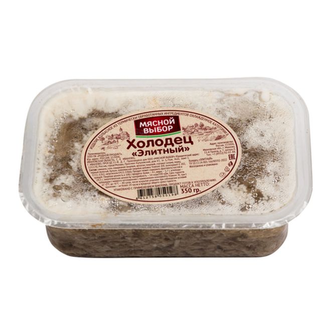 Холодец представляет собой застывшую, равномерно перемешанную массу, состоящую из желе и мелко нарубленного вареного мяса. Поверхность продукта ровная, с незначительным количеством жира на поверхности желе. На разрезе представляет собой кусочки вареного мяса среднего размера в прозрачном желе. Форма и размер продукта соответствуют форме упаковки (овальной); длина / ширина / высота составляют 12 / 10 / 5,5 см соответственно.