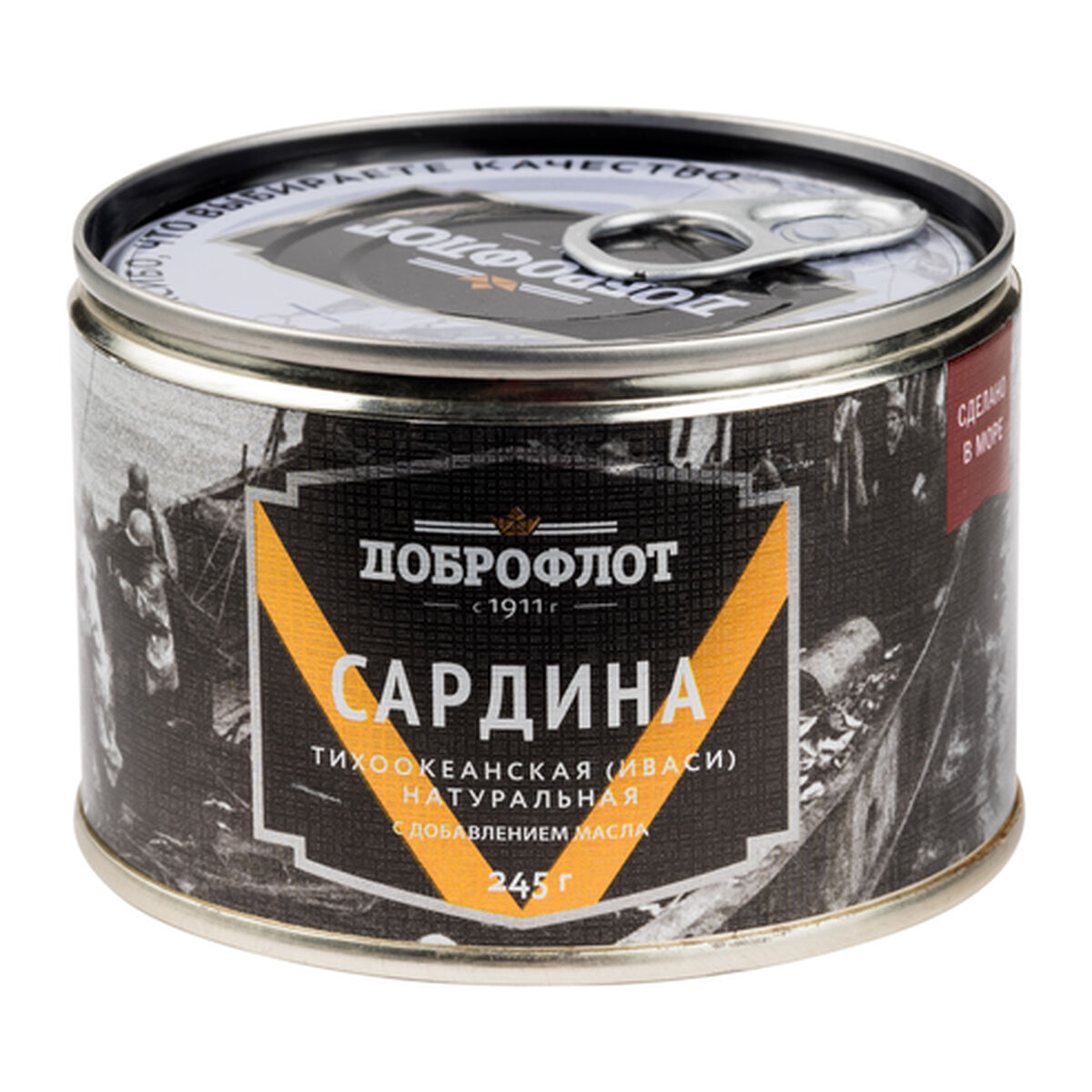 Натуральные рыбные консервы с добавлением масла, сардина тихоокеанская (иваси) натуральная, куски, стерилизованные, под торговой маркой «Доброфлот» произведены КРКПБ (плавбаза) «Всеволод Сибирцев» для АО «Южморрыбфлот» КРКПБ «Всеволод Сибирцев», завод № П08 в России. Образец приобретен в магазине «Глобус» по адресу: г. Москва, Новоухтомское ш., д. 2.
