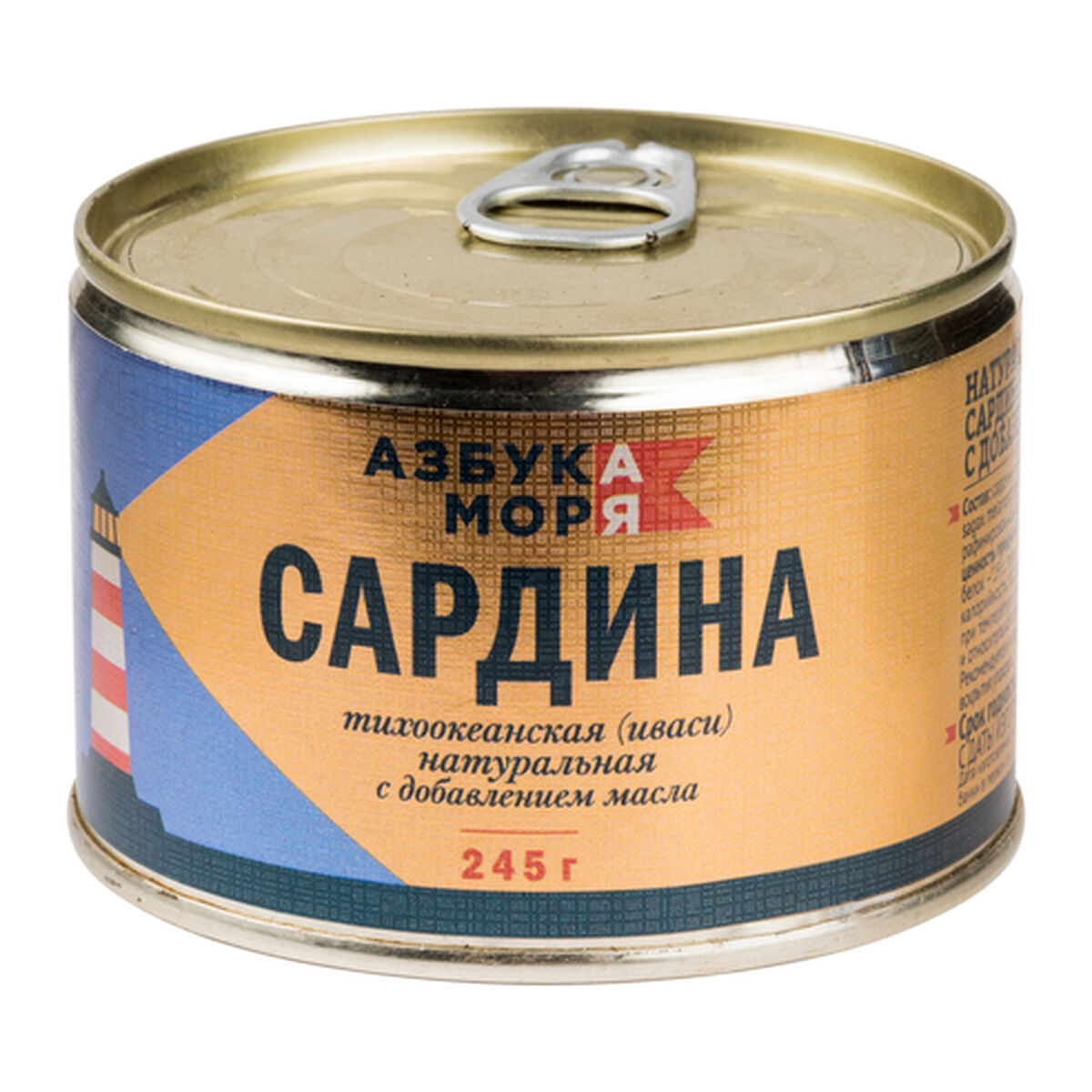 Натуральные рыбные консервы с добавлением масла, сардина тихоокеанская (иваси) натуральная с добавлением масла, куски, стерилизованные, под торговой маркой «Азбука моря» произведены КРКПБ (плавбаза) «Всеволод Сибирцев» для АО «Южморрыбфлот» в России. Образец приобретен в интернет-магазине «Яндекс.Маркет».