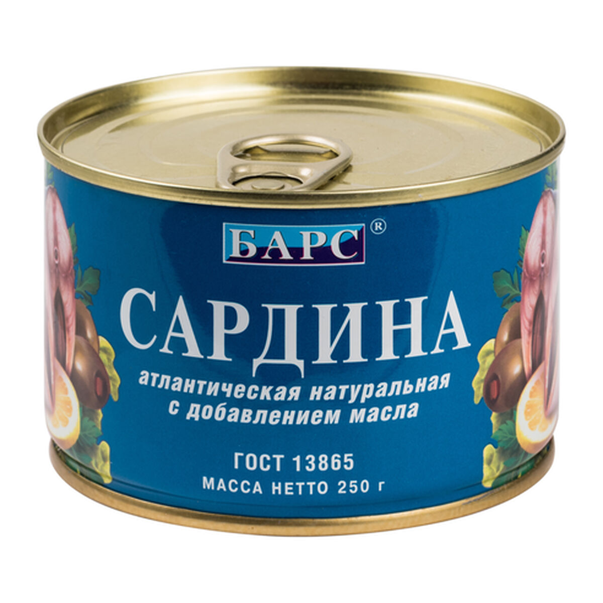 Натуральные рыбные консервы с добавлением масла, стерилизованные, сардина атлантическая (европейская) натуральная с добавлением масла (куски), под торговой маркой «Барс» произведены ООО «Барс» в России. Образец приобретен в магазине «Дикси» по адресу: г. Балашиха, д. Соболиха, ул. Новослободская, д. 13.
