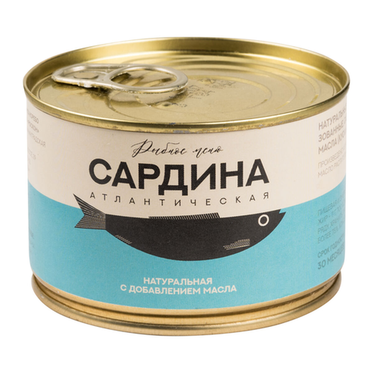 Натуральные рыбные консервы с добавлением масла, стерилизованные, сардина атлантическая натуральная с добавлением масла (куски), под торговой маркой «Рыбное меню» произведены ООО «Роскон» в России. Образец приобретен в интернет-магазине «Перекресток».