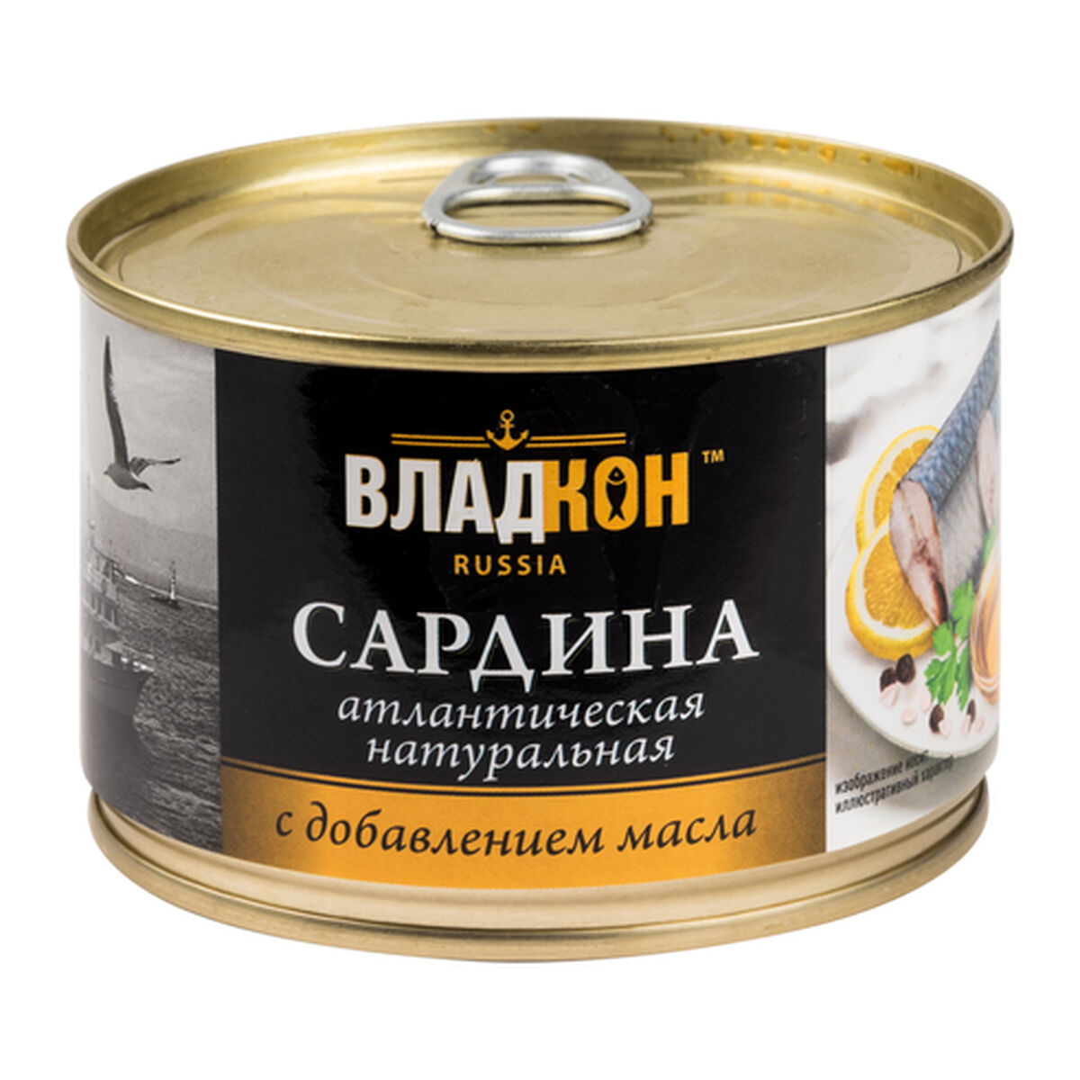 Натуральные рыбные консервы с добавлением масла, стерилизованные, сардина атлантическая натуральная с добавлением масла (куски), под торговой маркой «Владкон» произведены ООО «Владимирский консервный завод» в России. Образец приобретен в интернет-магазине Ozon.