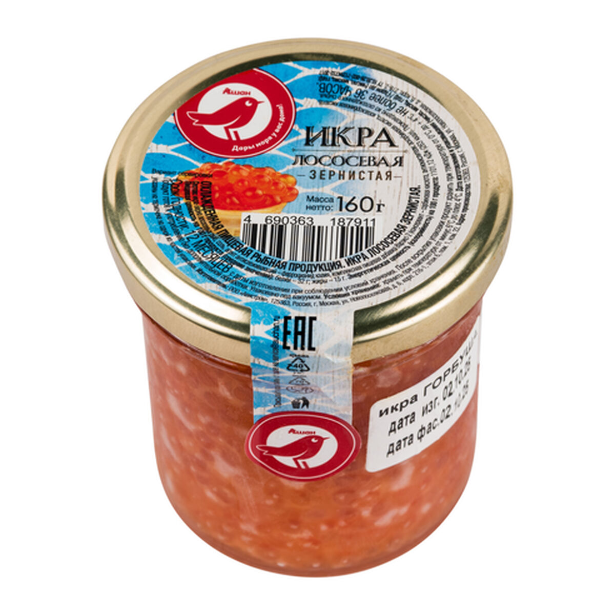 Охлажденная пищевая рыбная продукция, икра лососевая зернистая, горбуша, под торговой маркой «Ашан» произведена ООО «Авистрон» в России. Образец приобретен в магазине «Ашан» по адресу: г. Москва, ул. Вавилова, д. 3.