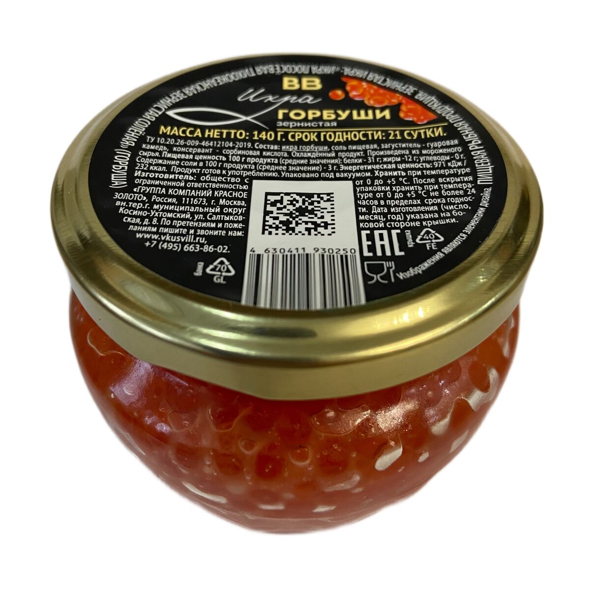 Пищевая рыбная продукция, зернистая икра «Икра лососевая тихоокеанская зернистая соленая» (горбуша), под торговой маркой «ВкусВилл» произведена ООО «ГК Красное золото» в России. Образец приобретен в магазине «ВкусВилл».
