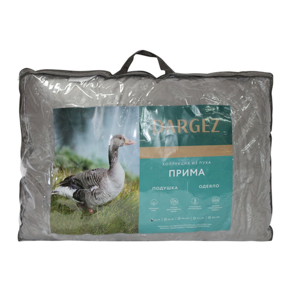 Подушка средняя пуховая «Прима» под торговой маркой Dargez произведена ООО «Дартекс» в России. Образец приобретен в интернет-магазине dargez-shop.ru.