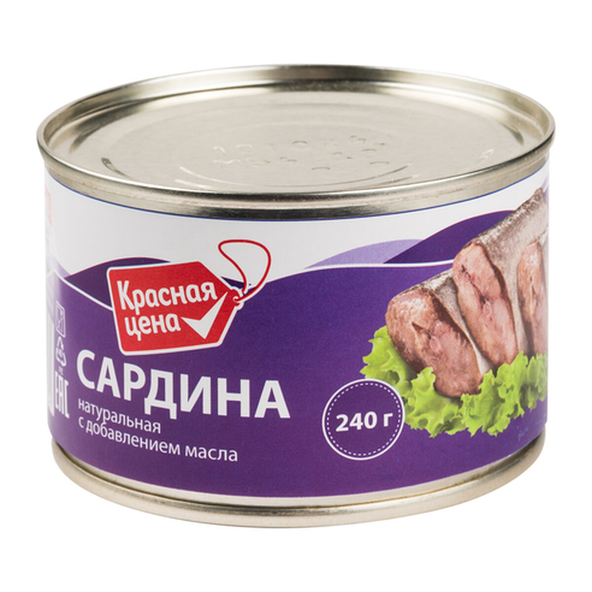 Рыбные консервы, консервы из рыбы натуральные с добавлением масла, стерилизованные, сардина тихоокеанская (иваси) натуральная с добавлением масла, куски, под торговой маркой «Красная цена» произведены АО «Южморрыбфлот» в России. Образец приобретен в магазине «Пятерочка» по адресу: г. Москва, муниципальный округ Выхино-Жулебино, ул. Ферганская, д. 6.