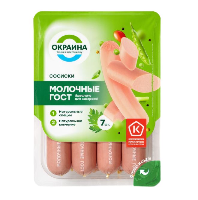Сосиски «Молочные», мясной продукт, колбасные изделия вареные, торговая серия «Молокуши», под торговой маркой «Вязанка» произведены ЗАО «Стародворские колбасы» в России. Образец приобретен в интернет-магазине Vprok.ru «Перекресток».