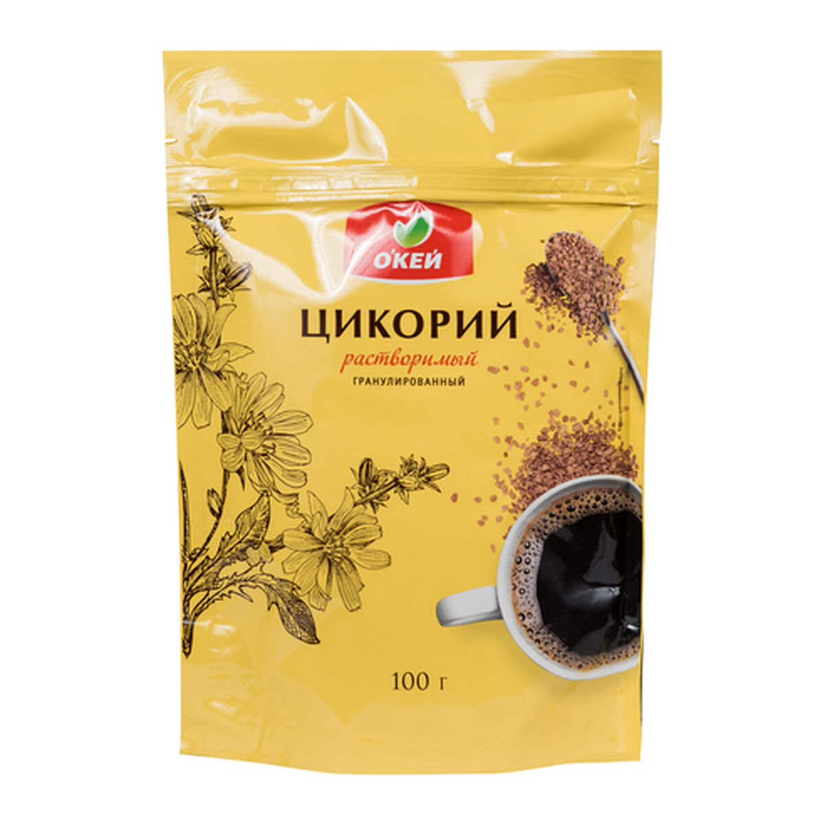Цикорий натуральный растворимый гранулированный под торговой маркой «О’кей» произведен ООО «Фаворит» для ООО «О’кей» в России. Образец приобретен в магазине «О'кей» по адресу: г. Москва, ул. Святоозерская, д. 1А.