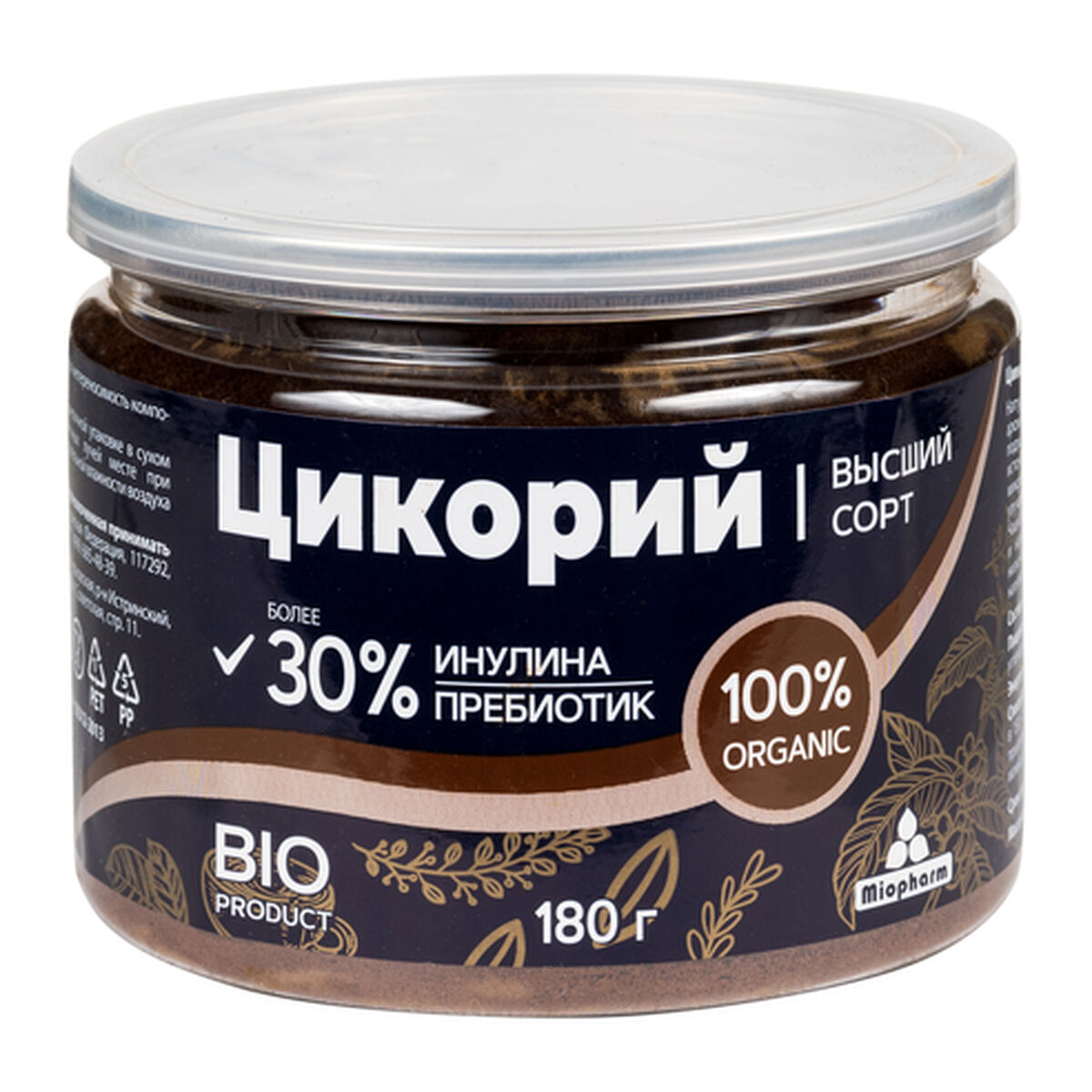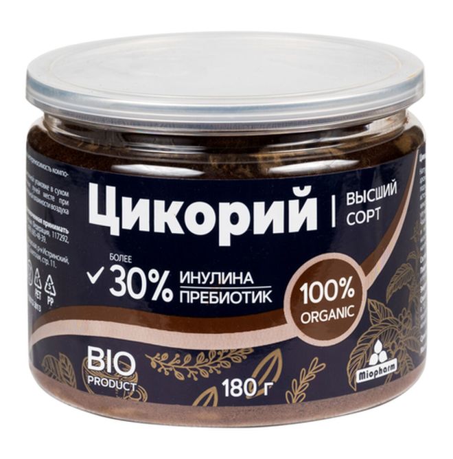 Цикорий растворимый порошкообразный BIO под торговой маркой Miopharm произведен ООО «Миофарм» в России. Образец приобретен в интернет-магазине Ozon.