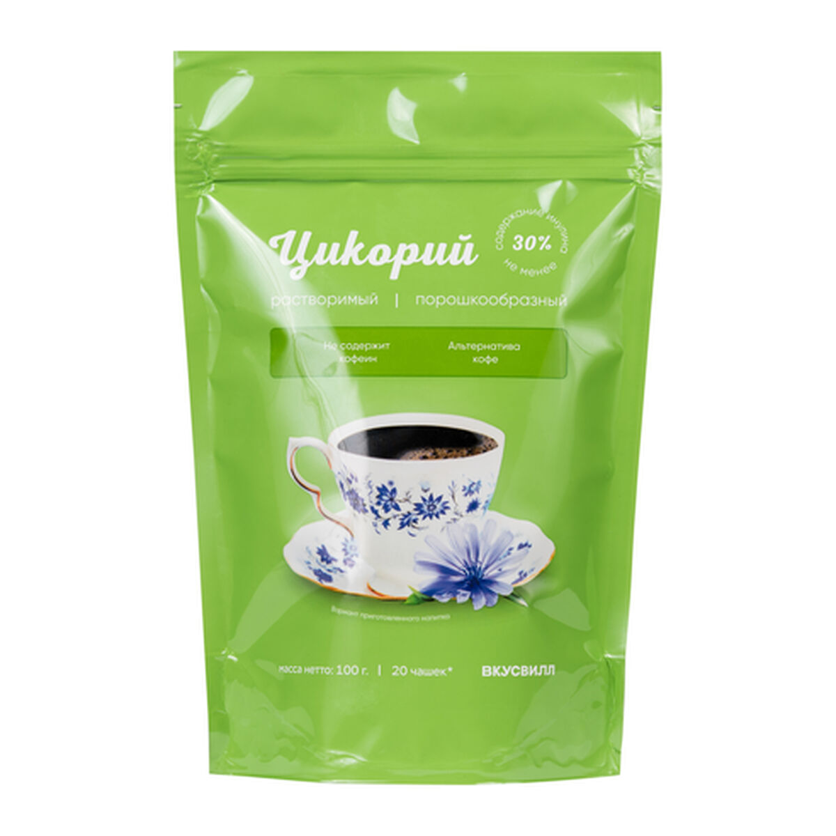 Цикорий растворимый порошкообразный под торговой маркой «ВкусВилл» произведен ООО «Славкофе» в России. Образец приобретен в интернет-магазине «ВкусВилл».