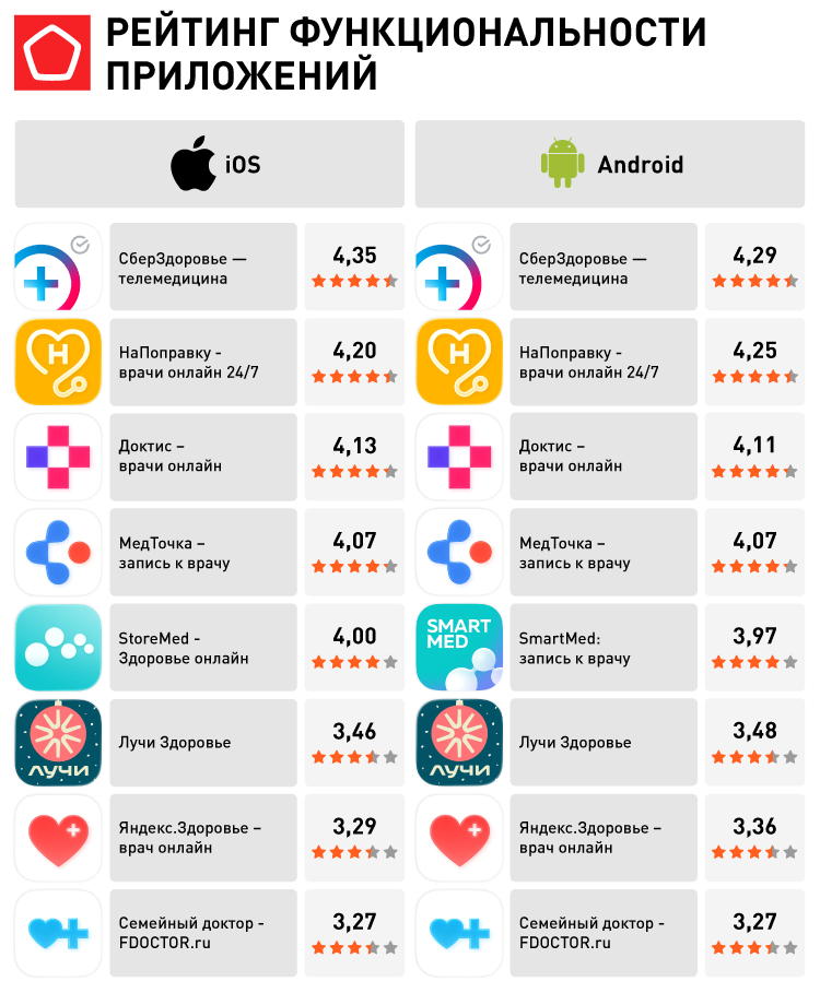 - По результатам исследования лидером по функциональности и удобству использования стало приложение «СберЗдоровье», которое продемонстрировало высокие баллы по большинству критериев, включая поиск врачей, фильтрацию, полноту карточек и скорость записи на прием.