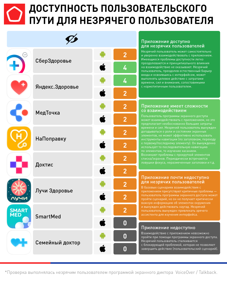 Однако результаты тестирования оказались крайне слабыми: подавляющее большинство сервисов продемонстрировало критически низкий уровень доступности и практически не адаптировано для работы с программами экранного доступа. Ключевые проблемы включают отсутствие меток у кнопок (неподписанные элементы), некорректное озвучивание состояний (например, когда скринридер не сообщает, выбран ли нужный слот времени), а также нарушения в логике перемещения фокуса и навигации, из-за чего прерывается пользовательский путь. По итогам тестирования цифровой доступности наименьшее количество барьеров было отмечено только в приложениях «СберЗдоровье» (iOS) и «Яндекс.Здоровье» (Android).
