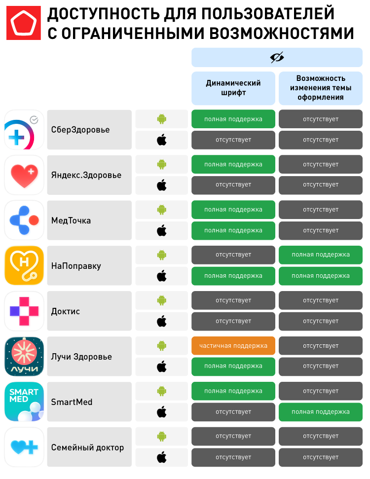 - Адаптация для людей с ограниченными возможностями качественно реализована лишь у «СберЗдоровье» (iOS) и «Яндекс.Здоровье» (Android). Остальные сервисы требуют серьезной доработки в этой части.