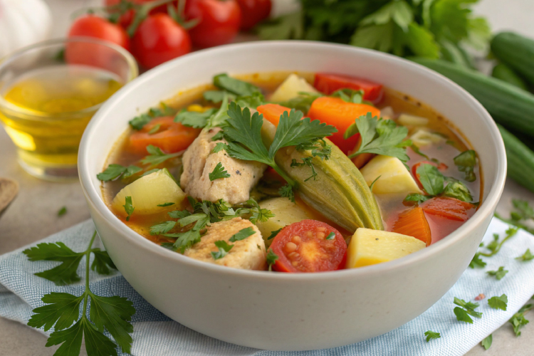 Ингредиенты (на 4 порции): бамия свежая — 200 г, куриное филе — 300 г, морковь — 1 шт., лук — 1 шт., томаты — 2 шт. или 150 мл томатного сока, чеснок — 2 зубчика, картофель — 2 шт., оливковое масло — 2 ст. ложки, лимонный сок — 1 ч. ложка, зелень (кинза, петрушка, укроп) — 1 пучок, соль, перец — по вкусу, вода или куриный бульон — 1,2–1,5 л.