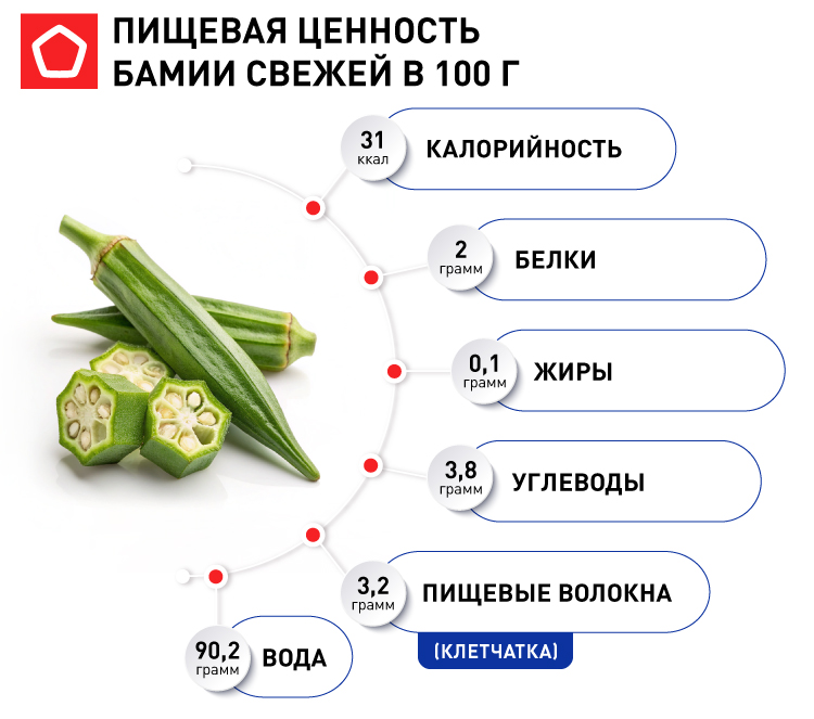 Секрет популярности бамии кроется не только во вкусе, но и в ее составе. В каждом стручке спрятан настоящий клад витаминов, минералов и других полезных веществ.