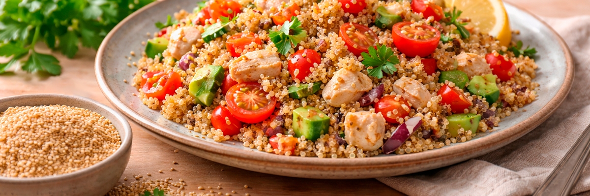 Ингредиенты: 250 г киноа (вареного), 8–10 помидоров черри, 1 болгарский перец (крупный), 1 огурец, небольшой пучок петрушки и другая зелень по вкусу (кинза, базилик и т. д.), лимонный сок, оливковое масло, соль, перец.
