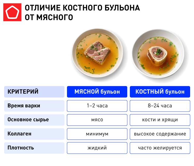 Костный бульон — это результат длительного (иногда суточного) томления костей, суставов, хрящей и костного мозга, в процессе которого вода насыщается белковыми структурами, минералами и жирами. Такой бульон принципиально отличается от классического мясного — и по составу, и по физиологическому воздействию на организм.