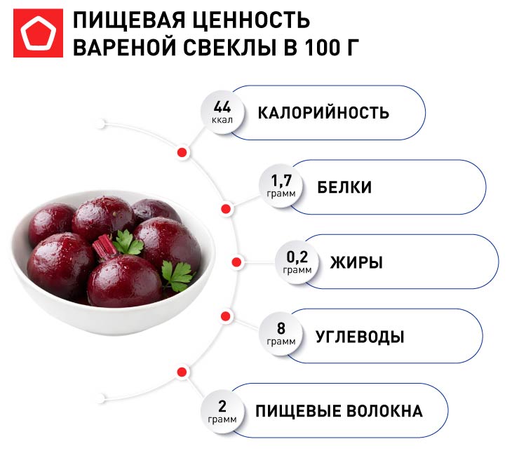 Свекла — низкокалорийный, но биохимически насыщенный овощ. В среднем 100 г готового продукта содержат около 40–45 ккал, однако способ приготовления влияет на концентрацию нутриентов.