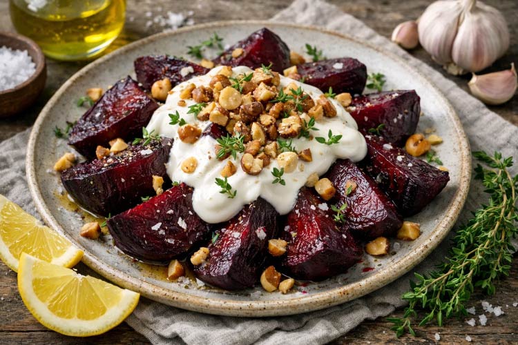 Теплая запеченная свекла с йогуртовым соусом и орехами