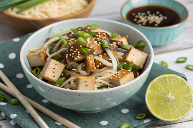 Эноки промойте, обрежьте нижнюю часть и разделите на пучки. Разогрейте сковороду, добавьте каплю кунжутного масла и слегка обжарьте грибы (2–3 минуты, не дольше). Нарежьте тофу кубиками и добавьте к грибам, аккуратно прогрейте еще минуту. В отдельной миске смешайте соевый соус, сок лайма, мед и имбирь — получится ароматная заправка. Снимите сковороду с огня, полейте соусом и перемешайте. Подавайте салат теплым, посыпав зеленым луком и кунжутом.