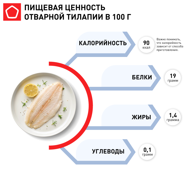 Низкая калорийность. Тилапия относится к низкокалорийным продуктам, что делает ее удобной для ежедневного употребления без риска превышения энергетической нормы. Она помогает сохранить чувство сытости, не вызывая тяжести и переедания, что особенно важно при рациональном питании и контроле веса.