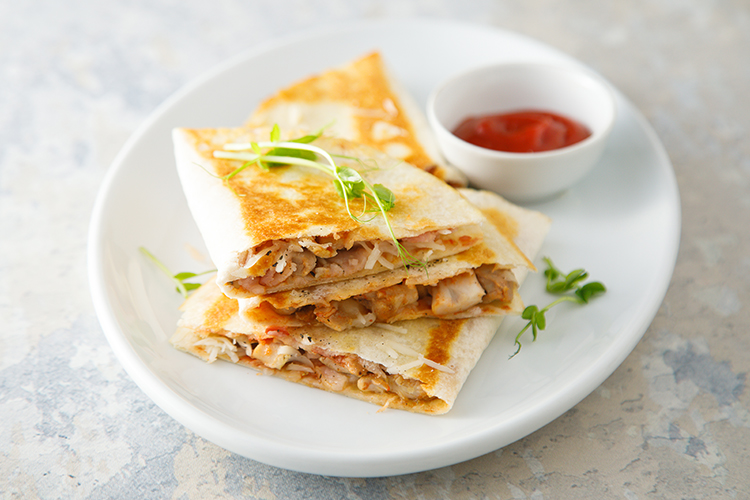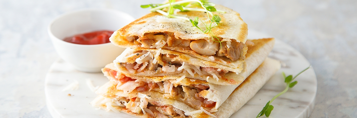 Ингредиенты: 2 тортильи, 120 г запеченной курицы (лучше бедро или голень), 1–2 ломтика сырокопченого бекона, горсть тертого сыра, 2 ст. ложки томатного соуса, молотый перец, растительное масло.