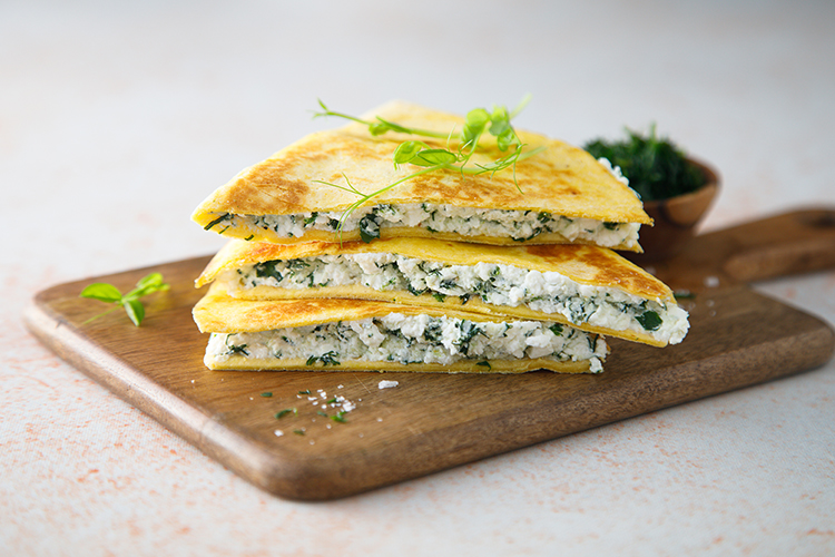 Ингредиенты: 1–2 тортильи, 150 г феты или брынзы, пучок зелени (петрушка, кинза, укроп, зеленый лук), молотый перец, чеснок (сушеный или запеченный, по желанию), растительное масло для обжарки.