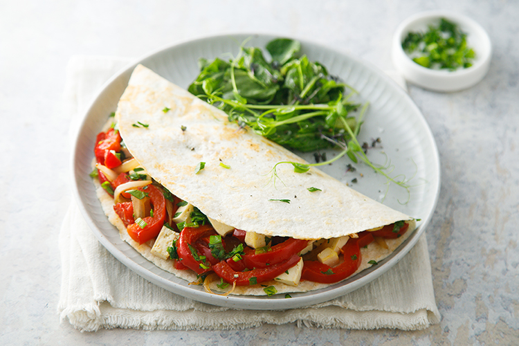 Ингредиенты: 2 тортильи, 1 болгарский перец, 1 луковица, 4 ломтика тофу, 1–2 ст. ложки соевого соуса, зелень (петрушка, зеленый лук, проростки), растительное масло.