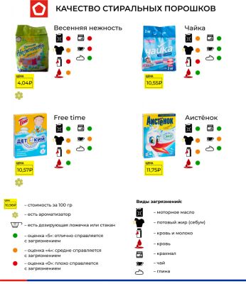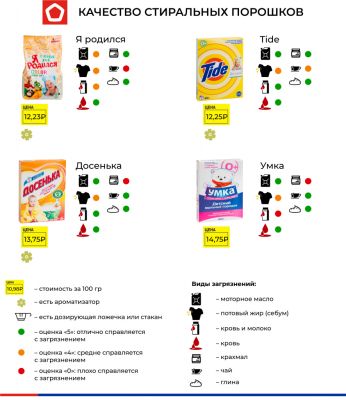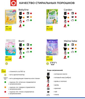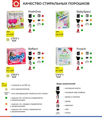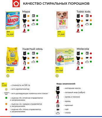 Вашему вниманию – сводная инфографика, благодаря которой вы сможете понять, как каждый детский порошок отстирывает то или иное загрязнение. Интересно, что с пятнами крови и глины отлично справились почти все исследованные порошки. Больше всего затруднений вывали загрязнения кровью с молоком и крахмалом.