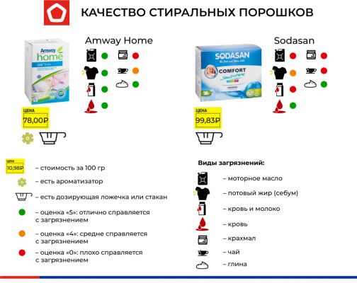 - Наличие дозирующего приспособления в упаковке – это не плюс и не минус: кому-то нужно, у кого-то уже есть. Но если вам нужны стаканчик, ложечка или что-то подобное для дозировки порошка, вы найдете это в упаковках Amway Home, Frosch, Meine LIEBE, PoshOne, Reflect и Sodasan. Кстати, отметим, что все эти средства для стирки – наиболее дорогие из представленных в исследовании.